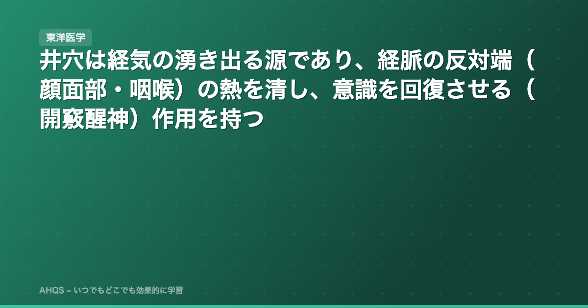「井穴は経気の湧き出る源であり、経脈の反対端の熱を清し、意識を回復させる」という説明は、霊枢・難経を礎とし、甲乙経・千金要方・針灸大成など歴代の臨床典籍で実証的に発展してきた古典的コンセンサスと言えます。