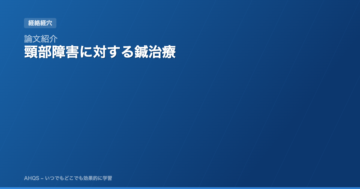 頸部痛は腰痛に次いで高い有病率を示し、世界的には労働障害の第二位に挙げられる深刻な公衆衛生問題です。とりわけ「慢性非特異的頸部痛」は、画像検査で構造的病変を認めないにもかかわらず3か月以上持続し、日常生活動作の制限、睡眠障害、心理的ストレス増大、労働生産性低下をもたらします。従来の鎮痛薬や理学療法では十分な改善が得られない例も散見されることから、鍼治療をはじめとする補完代替医療への関心が高まっています。本Cochraneレビューは、急性から慢性までの頸部痛を対象とした27件(5,462例)のランダム化比較試験を系統的に収集・評価し、鍼治療の有効性と安全性を総括的に検証しました