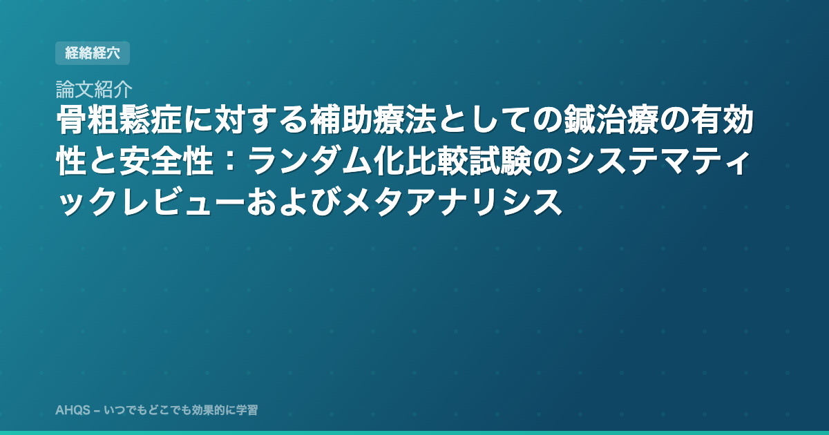 論文紹介:Efficacy and safety of acupuncture as an adjuvant therapy for osteoporosis: a systematic review and meta-analysis of randomized controlled trials「骨粗鬆症に対する補助療法としての鍼治療の有効性と安全性:ランダム化比較試験のシステマティックレビューおよびメタアナリシス」