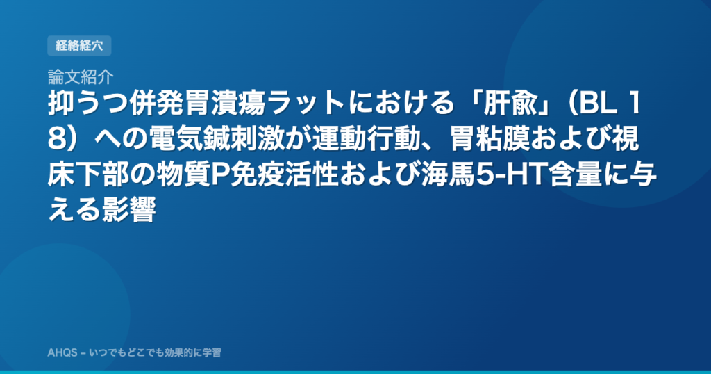 論文紹介:Effect of electroacupuncture stimulation of “Ganshu” (BL 18) on locomotor, gastric mucosal and hypothalamic SP immunoactivity and hippocampal 5-HT content in rats with depression and gastric ulcer 「抑うつ併発胃潰瘍ラットにおける「肝兪」(BL 18)への電気鍼刺激が運動行動、胃粘膜および視床下部の物質P免疫活性および海馬5-HT含量に与える影響」