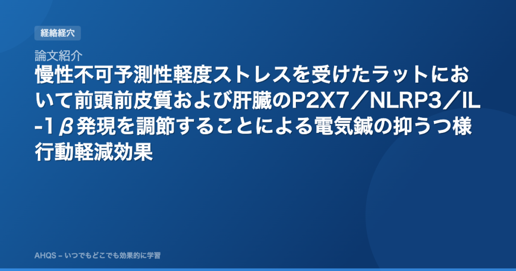 論文紹介:Electroacupuncture Alleviates Depressive-Like Behavior by Modulating the Expression of P2X7/NLRP3/IL-1β of Prefrontal Cortex and Liver in Rats Exposed to Chronic Unpredictable Mild Stress「慢性不可予測性軽度ストレスを受けたラットにおいて前頭前皮質および肝臓のP2X7/NLRP3/IL-1β発現を調節することによる電気鍼の抑うつ様行動軽減効果」