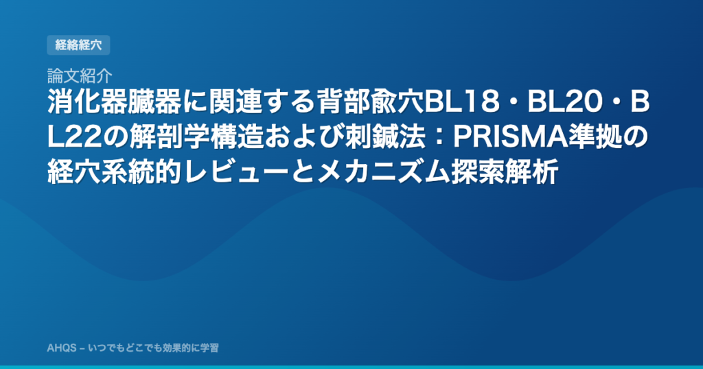 論文紹介:Anatomical structures and needling method of the back-shu points BL18, BL20, and BL22 related to gastrointestinal organs: A PRISMA-compliant systematic review of acupoints and exploratory mechanism analysis 「消化器臓器に関連する背部兪穴BL18・BL20・BL22の解剖学構造および刺鍼法:PRISMA準拠の経穴系統的レビューとメカニズム探索解析」