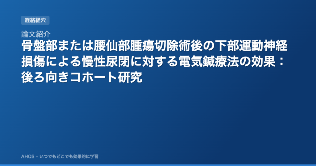 論文紹介:Effects of Electroacupuncture on Chronic Urinary Retention after Pelvic or Lumbosacral Tumor Resection Surgeries: A Retrospective Cohort Study「骨盤部または腰仙部腫瘍切除術後の下部運動神経損傷による慢性尿閉に対する電気鍼療法の効果:後ろ向きコホート研究」